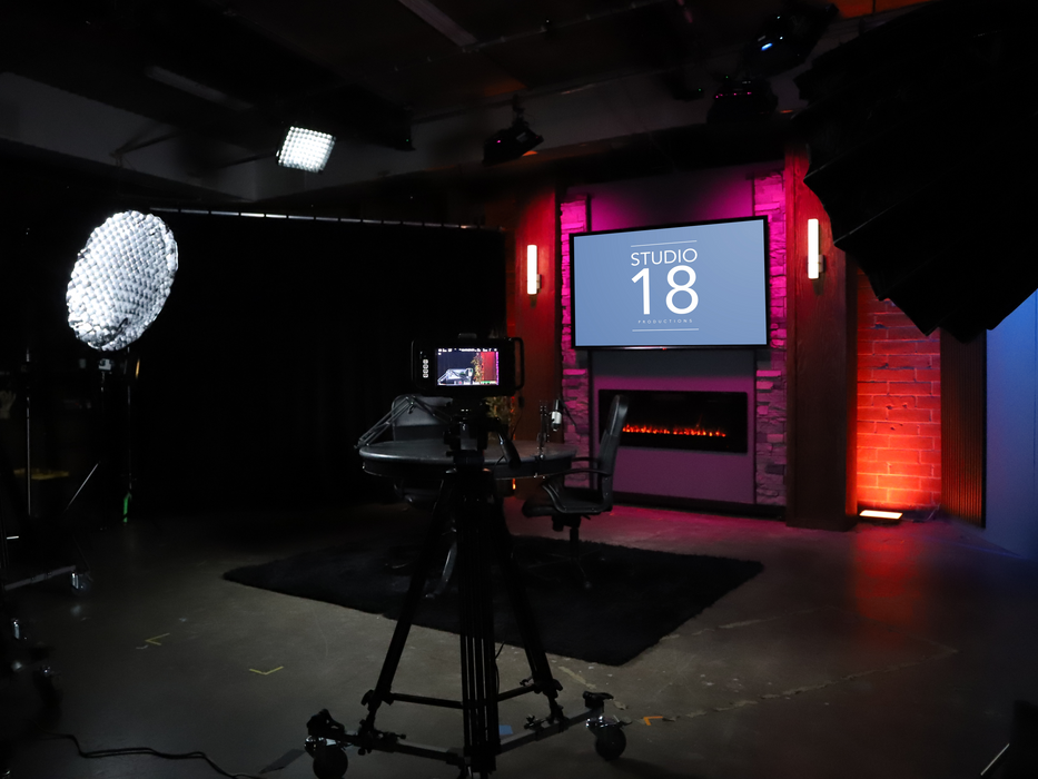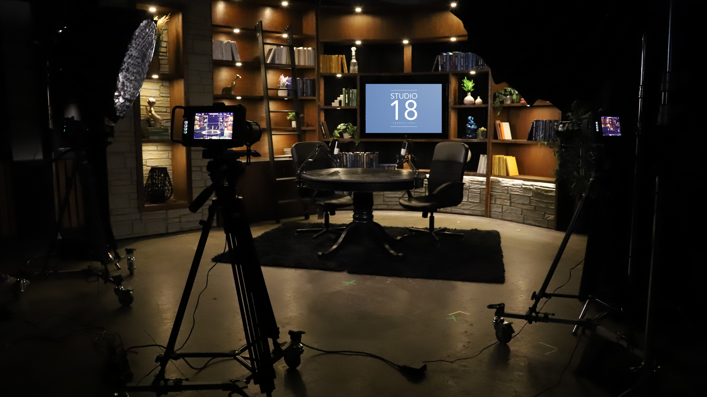 The library set in Studio A offers a sleek and acoustically friendly backdrop, combining modern design with functional soundproofing to enhance every podcast recording. It creates an inviting space that not only elevates the visual appeal of the studio but also supports clear, uninterrupted audio capture for engaging conversations.